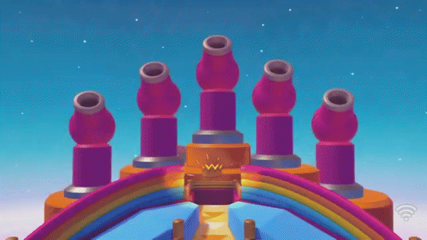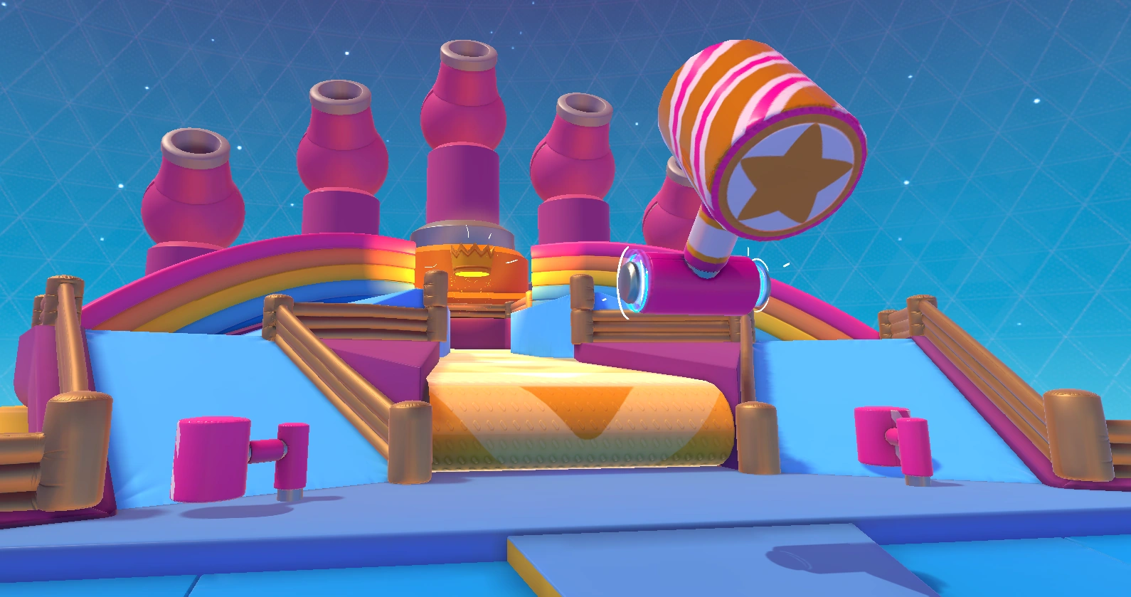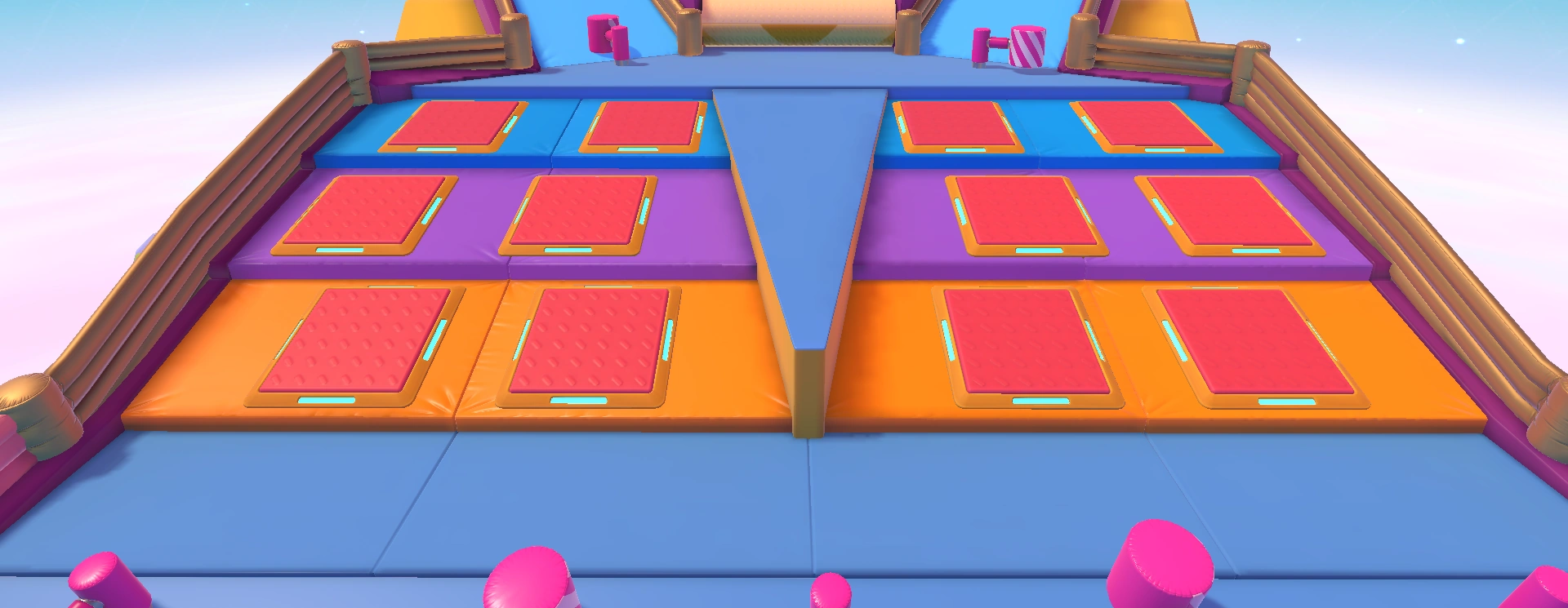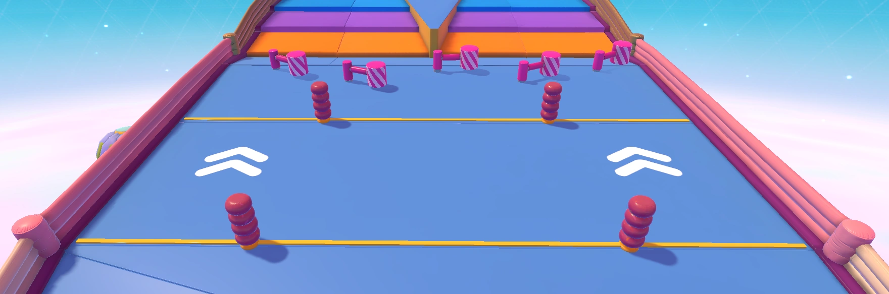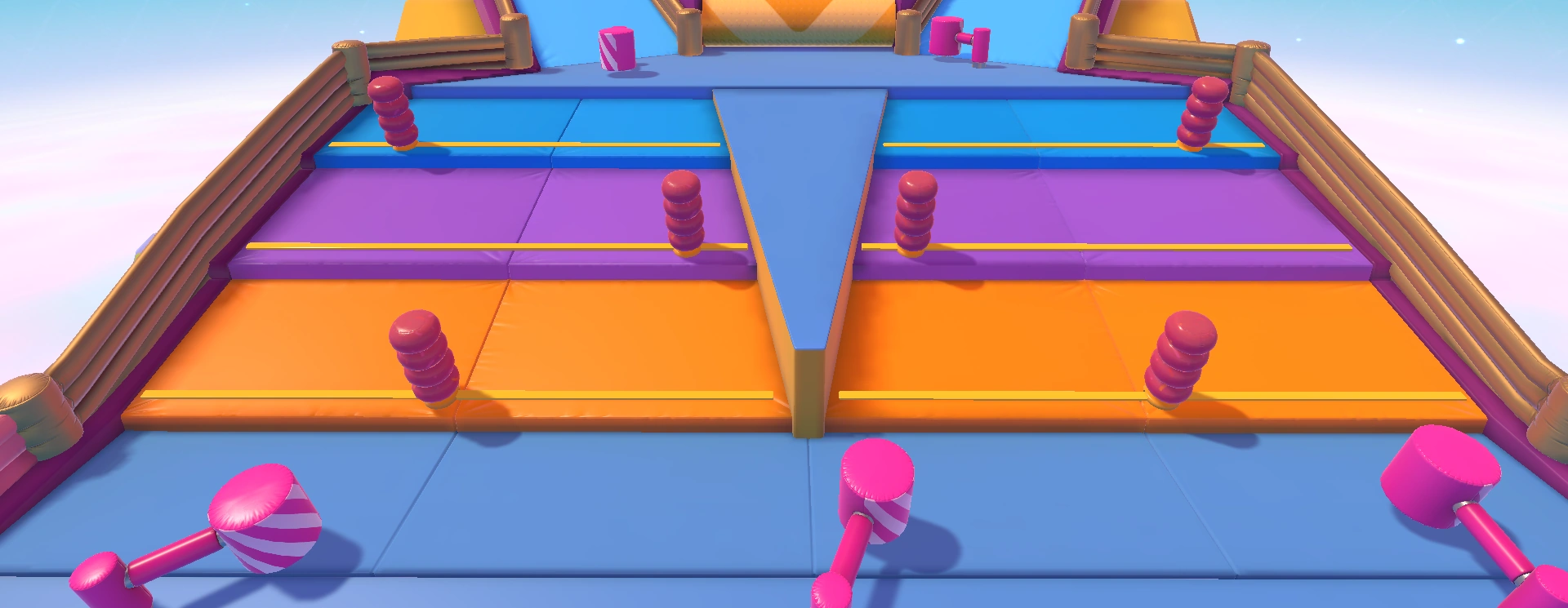 Following that, the third section consists of a series of spinning hammers, which can be tricky to get past. This is then followed by a series of steps that must be jumped. The final section is split into two, with a spinning hammer in the middle of the upward sloping ramps leading to the crown, which will float up and down periodically. Whoever grabs the crown first is the winner; if players miss the crown, they fall onto a conveyor belt that leads them back to the split path with the hammers in the middle of them.