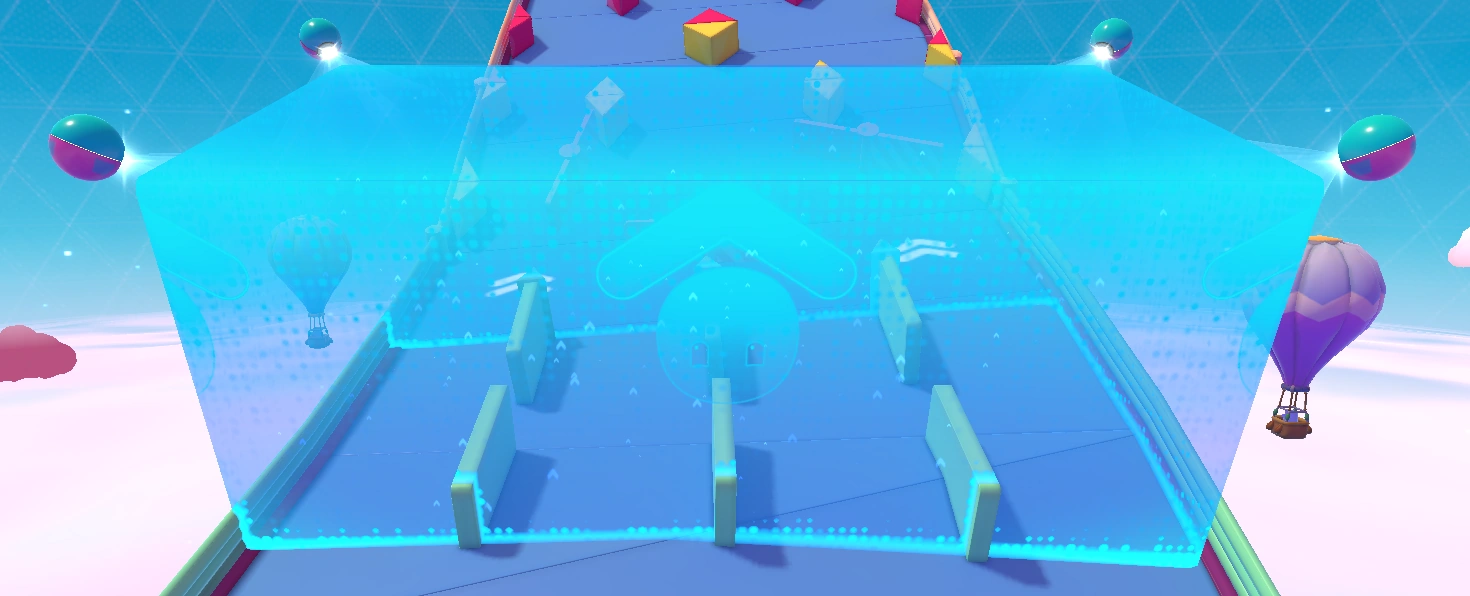 All players start on a raised platform which they then walk or jump off of. The first main section consists of a number of large spinners, two in the first row (one on each side) and then three further up (one on each side and one in the middle). The next main section is a series of diamond shaped structures. While traversing these two main sections, cannons in the distance shoot balls that can move the spinners, bounce off the diamond shapes, and knock the player down if they are unlucky to be in the way.