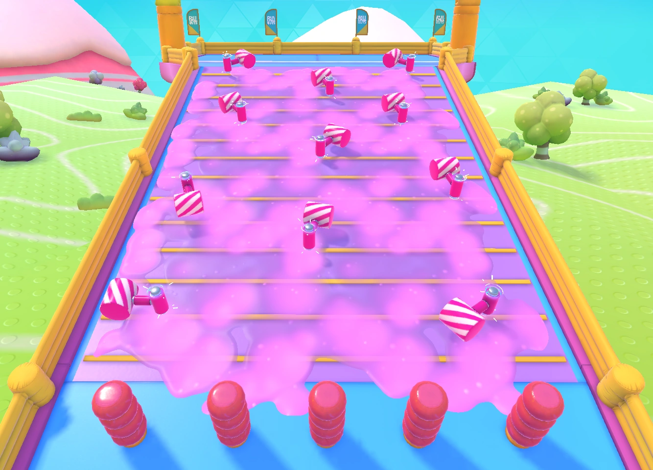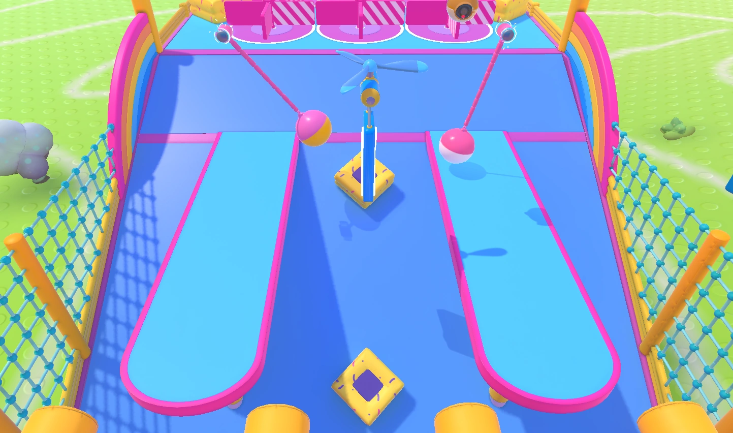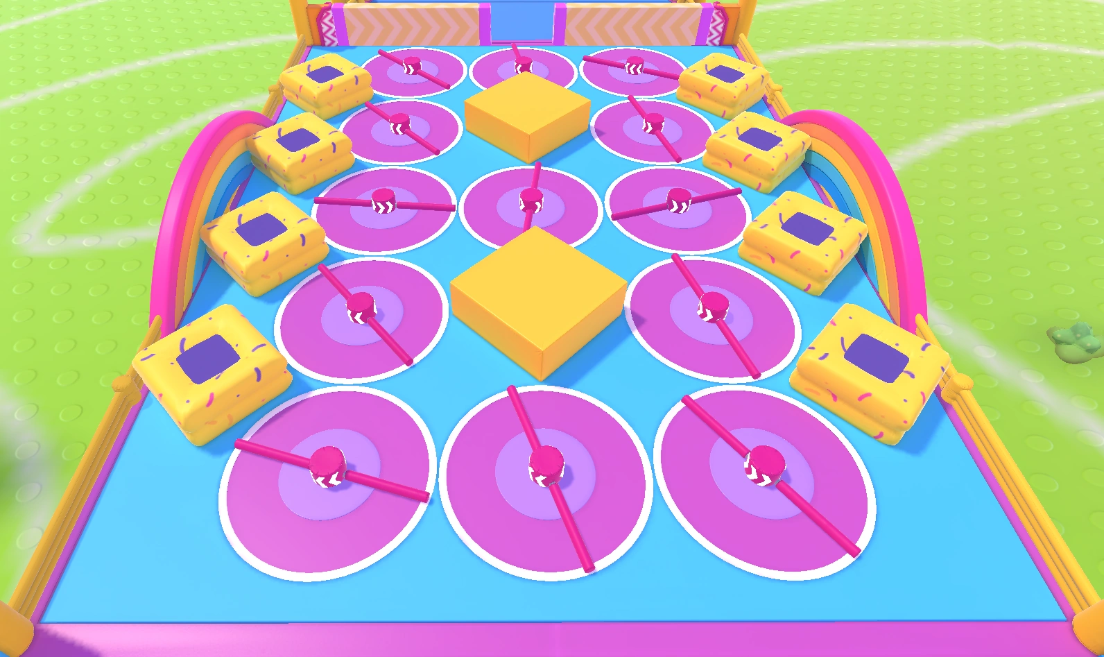 Hit Parade is a relatively short and linear course, with pathways for players to progress through even if they fall off the main sections of the level. The first section has three beams to cross, with a section underneath featuring downhill slime and an uphill climb if the player falls down. The second section has a series of Turnstiles (stuck between some Bumper Blocks and Padded Blocks), which can be passed by pushing through to spin them around, blocking other players who are behind. Large Moving Walls open and close at intervals to block players, requiring them to either wait or bounce on the heads of other players to pass through. The third section has a straight path with Pendulums swinging left and right which must be dodged - directly colliding with them may cause the player to fall sideways and land into another section underneath, featuring Conveyor Belts that push players further backwards and cause them to lose time, obliging them to return to an uphill climb which brings them back to the main path to restart the section. The last section is an uphill slime section with Donut Bumpers which again move left and right, bringing the players to the Finish Line.