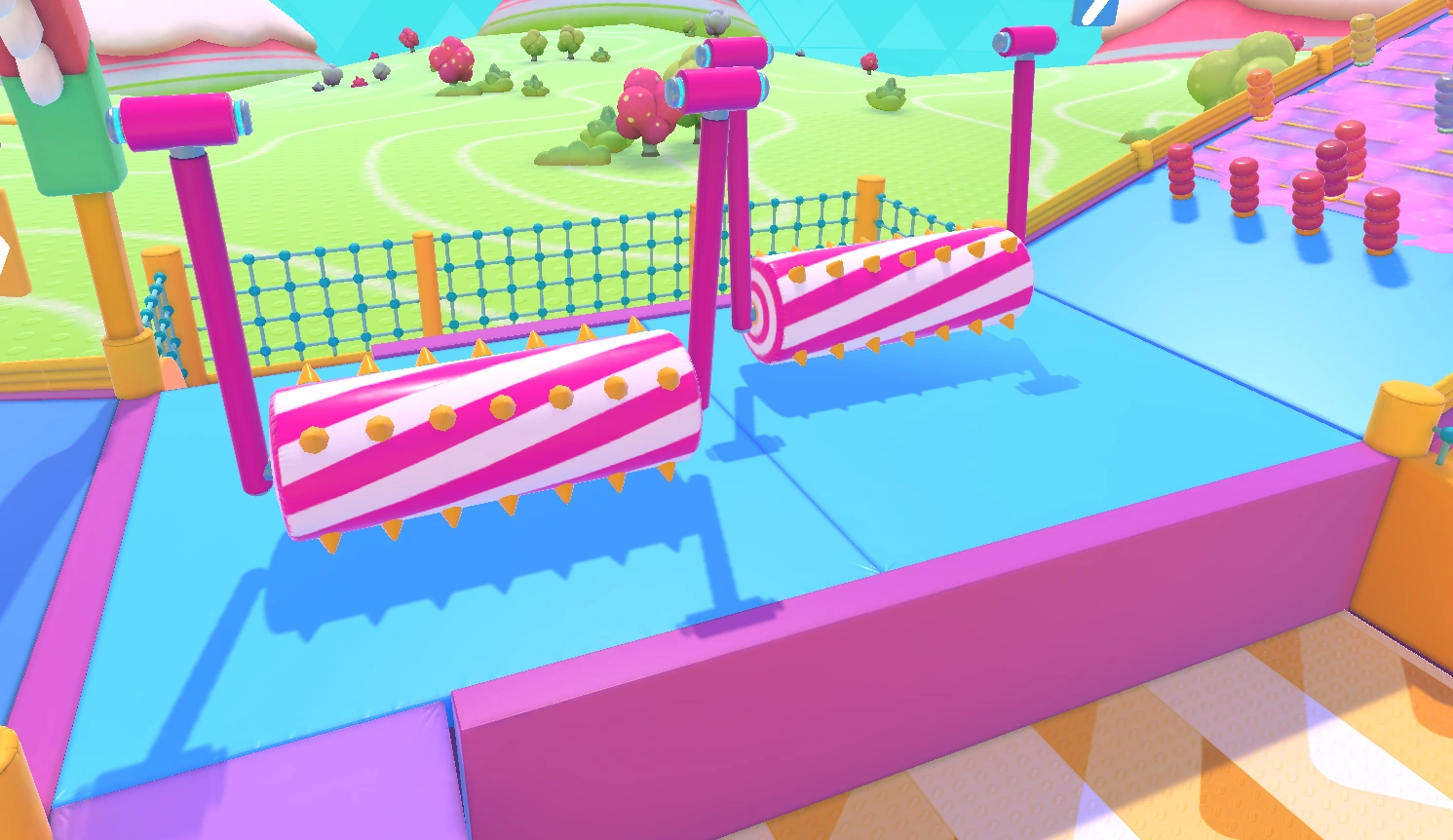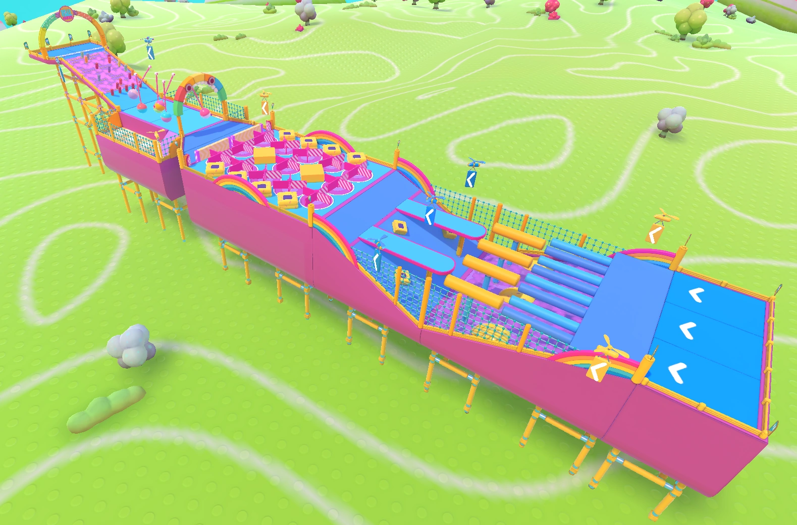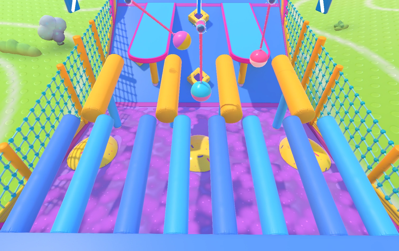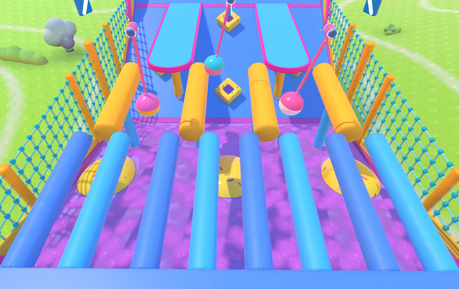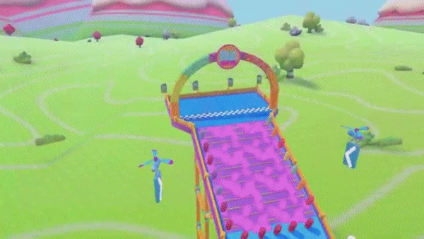 An example path would be to hit the middle Yeetus from the first set and fall to the lower level. Then, walk up the slope, head to the side Yeetuses and get flung over the turnstiles. Squeeze through the gap, then try to carefully hit the Yeetus in the middle so you do not get ruined too much by the pendulums. Alternatively, consider dropping to the side gutters and hit the Yeetuses there. At the final stretch, avoid the side groups of Yeetuses as it is easy to be knocked back. Instead, head up to the middle group of Yeetuses and try diving forwards, aiming to get hit by those and into the finish.