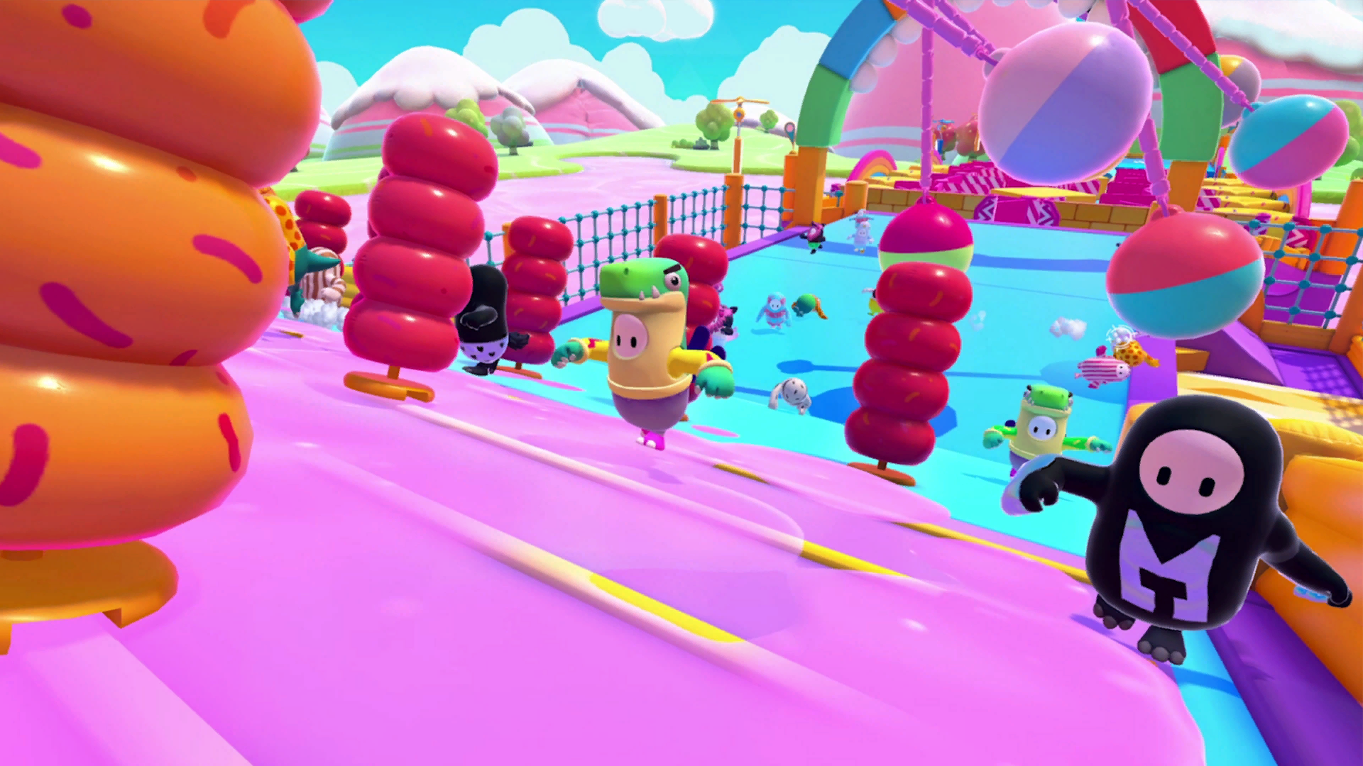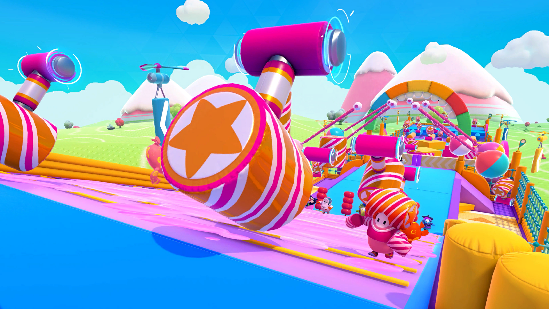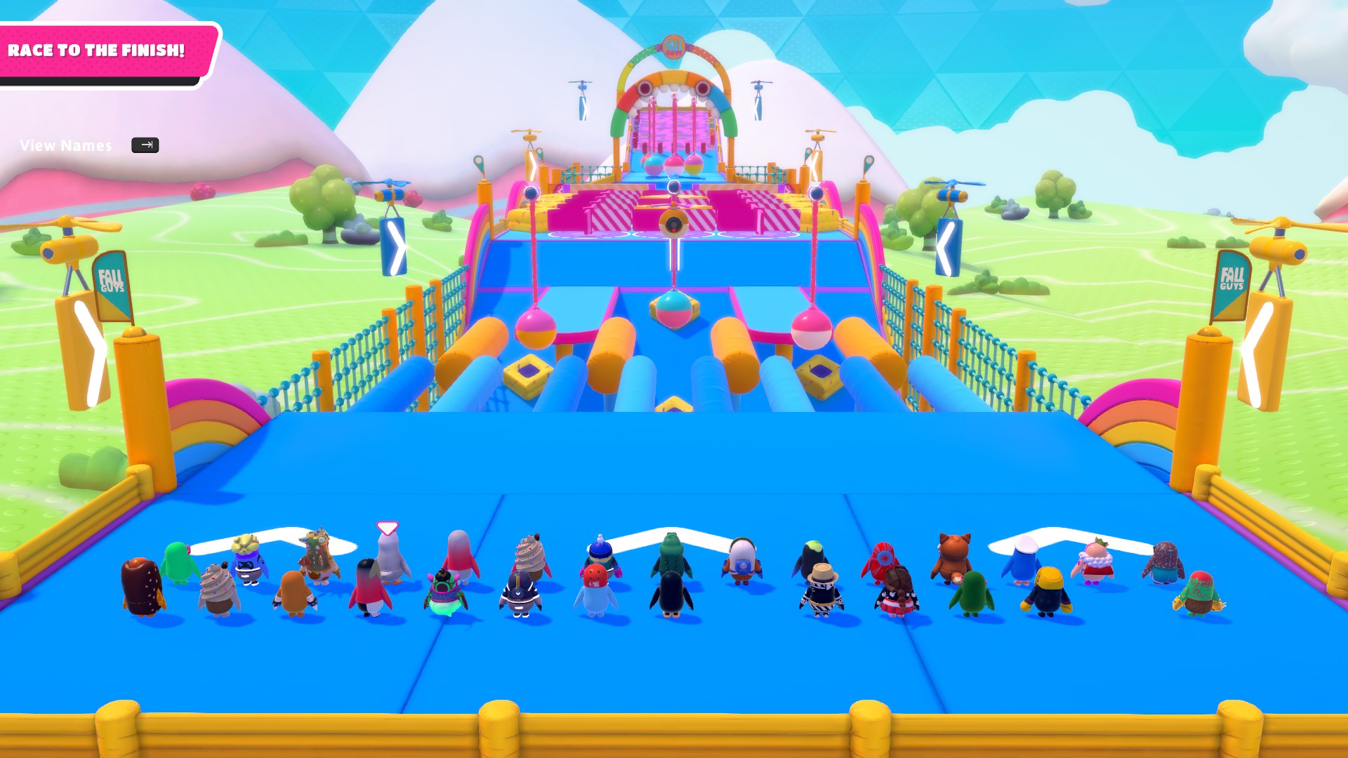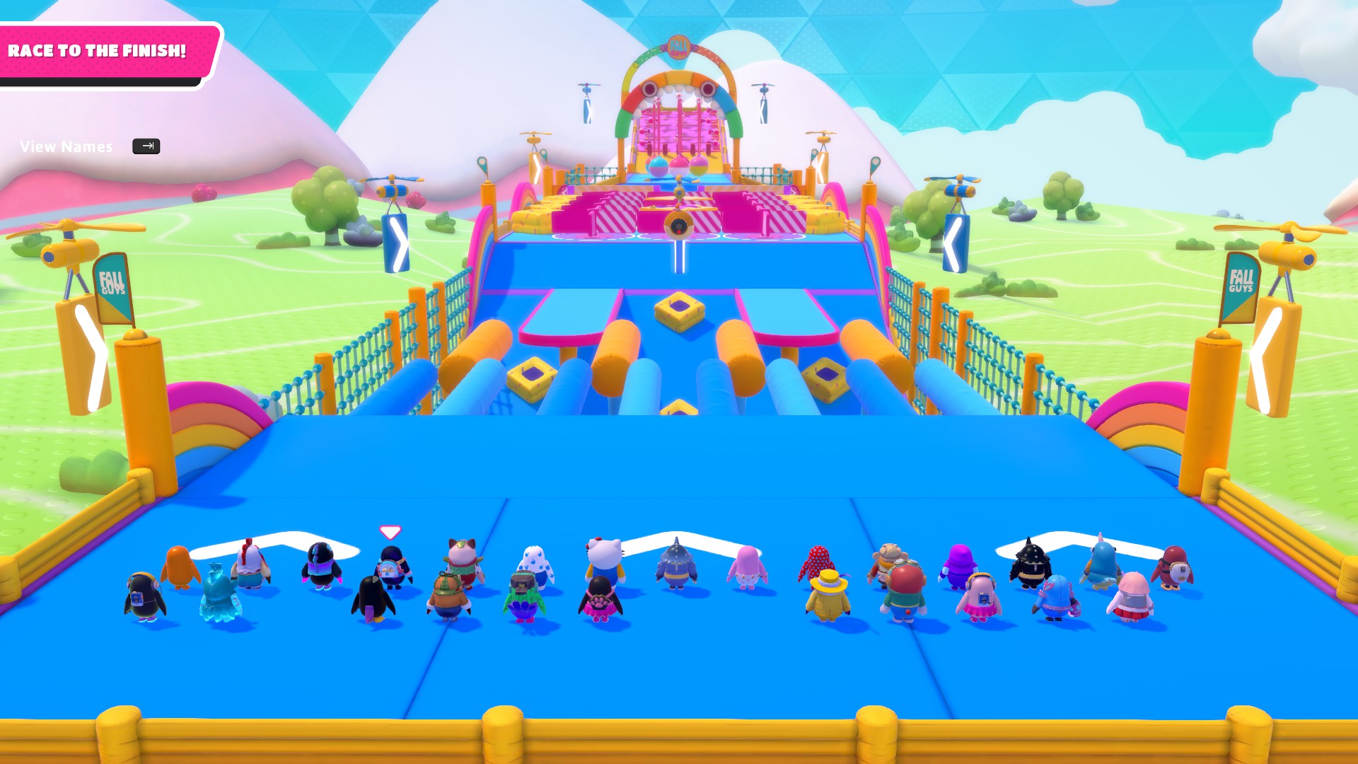 An example path would be to hit the middle Yeetus from the first set and fall to the lower level. Then, walk up the slope, head to the side Yeetuses and get flung over the turnstiles. Squeeze through the gap, then try to carefully hit the Yeetus in the middle so you do not get ruined too much by the pendulums. Alternatively, consider dropping to the side gutters and hit the Yeetuses there. At the final stretch, avoid the side groups of Yeetuses as it is easy to be knocked back. Instead, head up to the middle group of Yeetuses and try diving forwards, aiming to get hit by those and into the finish.