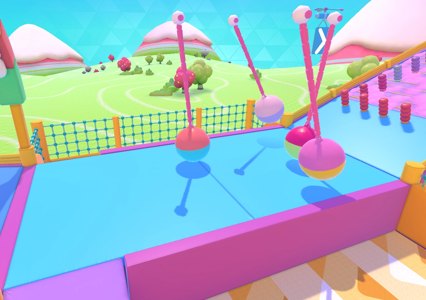 - For the pendulums swinging in the direction of the course rather than perpendicularly, these are far easier to dodge - just weave in-between these obstacles. A well-timed knock can hit you forward, but an ill-timed one will send you further backwards. At least it isn't as detrimental as being knocked into the lower section, though!