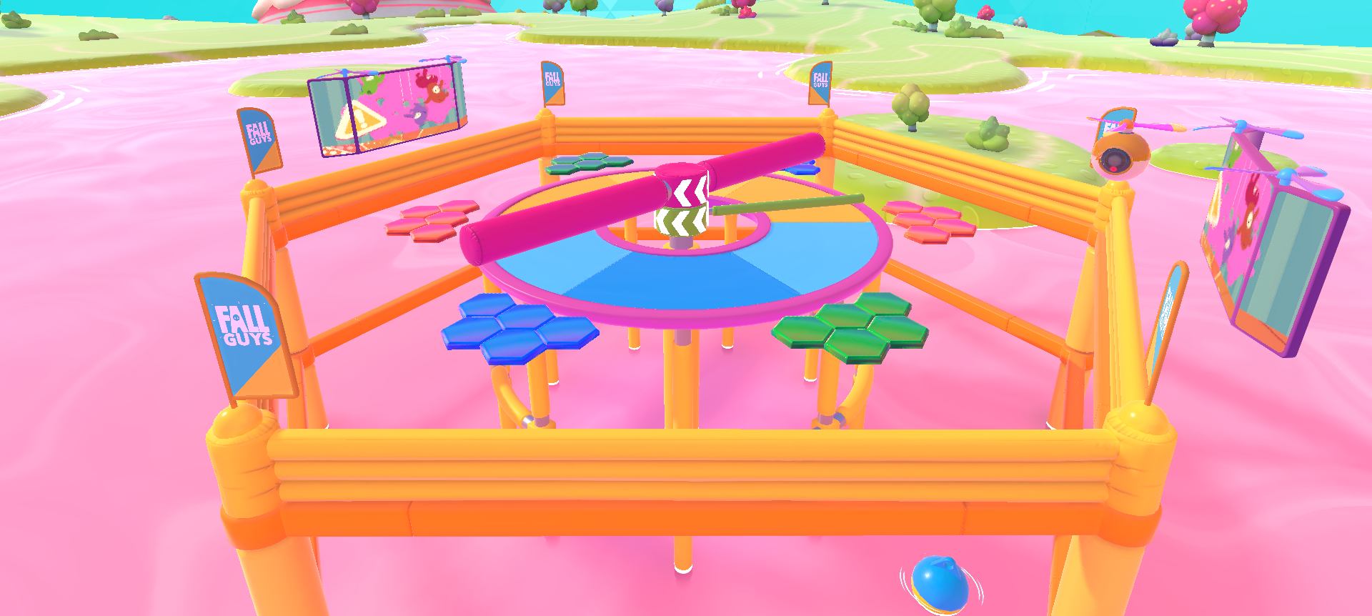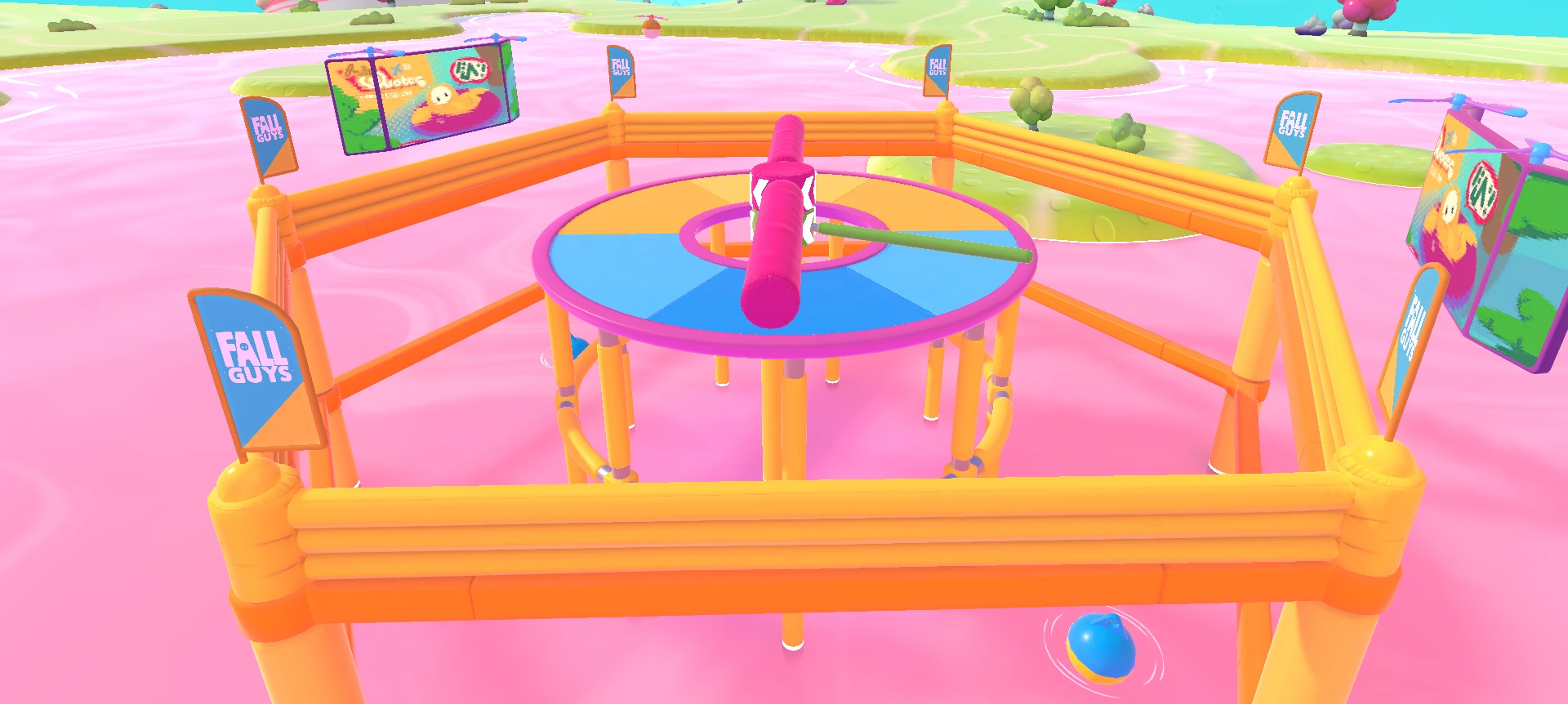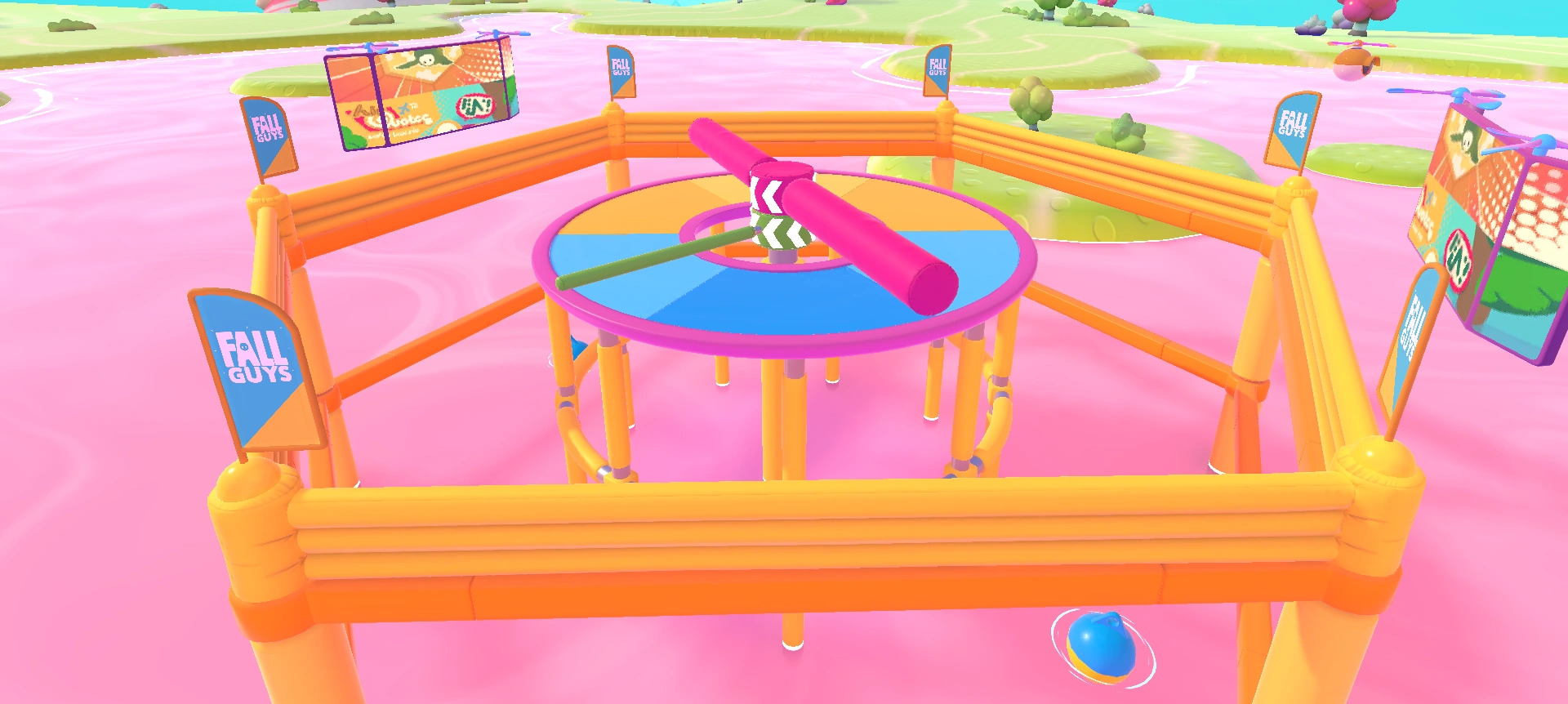 Jump Club is a survival round that consists of a circular platform with the center cut out. In the center are two rotating beams with the same center and are right on top of each other. The beam on top of the other spins slow and is very thick, and it is higher than the player. The bottom one is thinner, being low enough to jump over but high enough to knock over a player. It starts out spinning slowly, but as the round progresses, it gradually speeds up.
