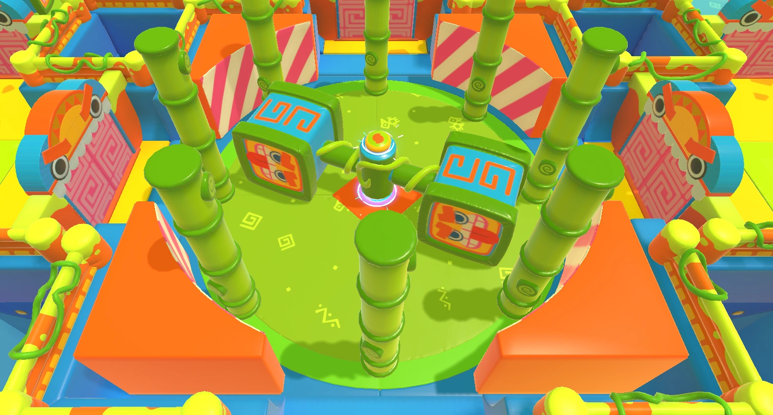 A circular room containing a large donut bumper orbited by two groups of four smaller donut bumpers: one group going clockwise and the other going counter-clockwise.