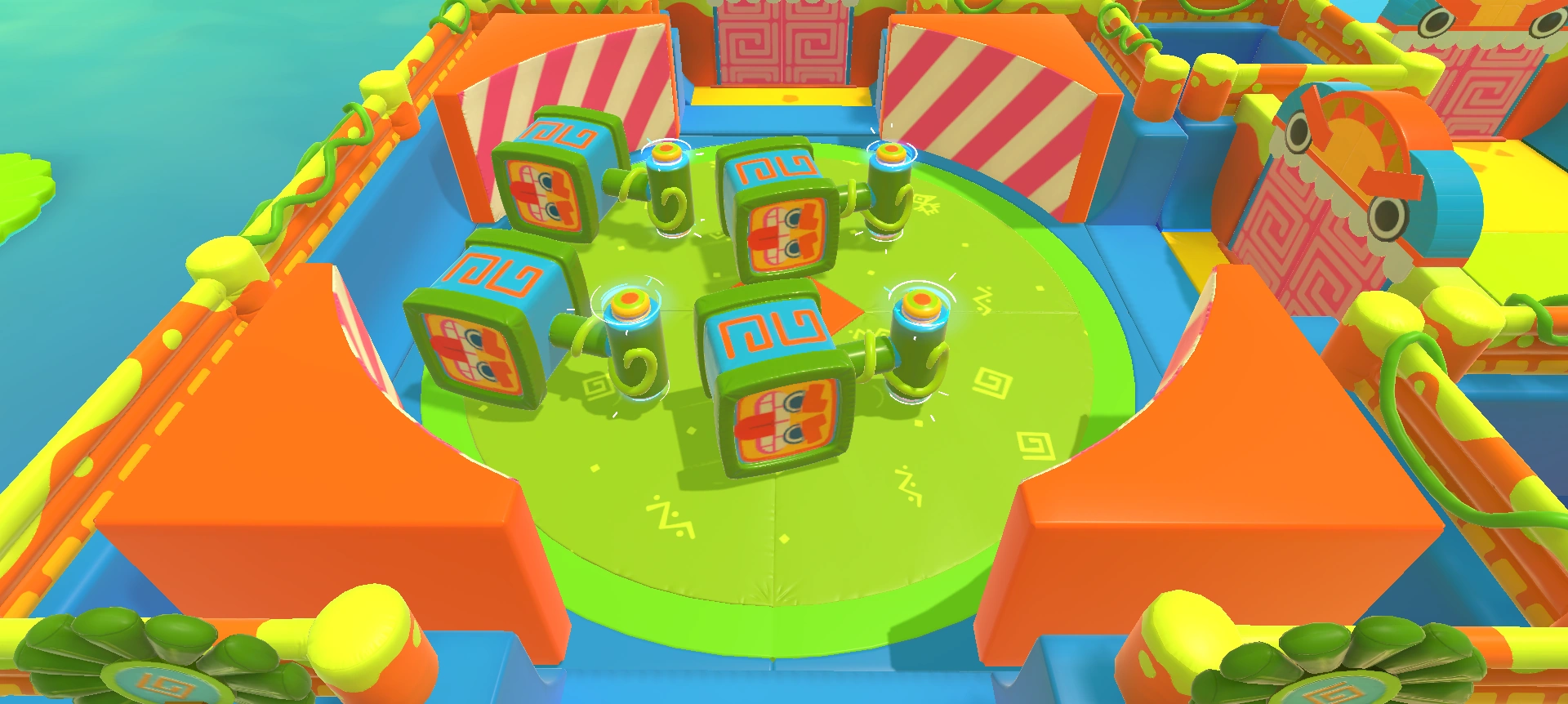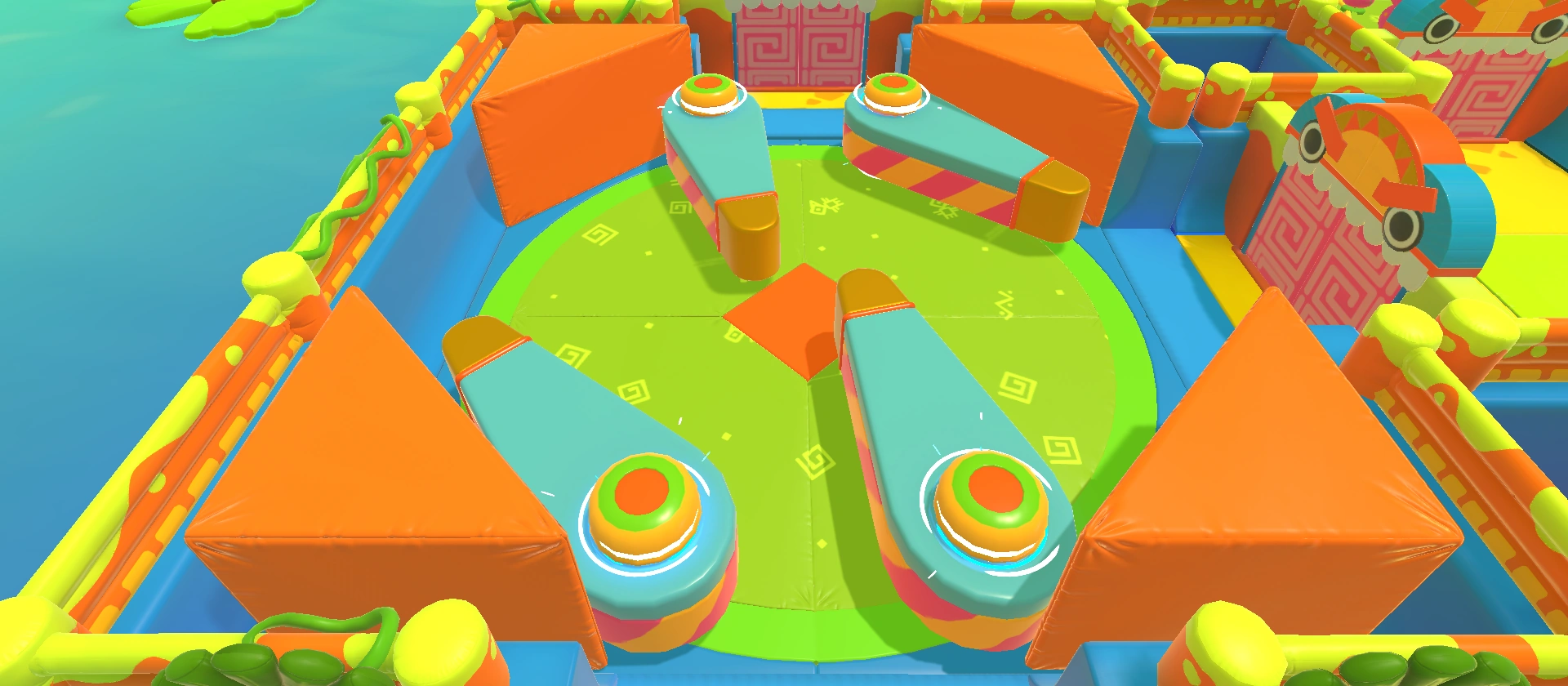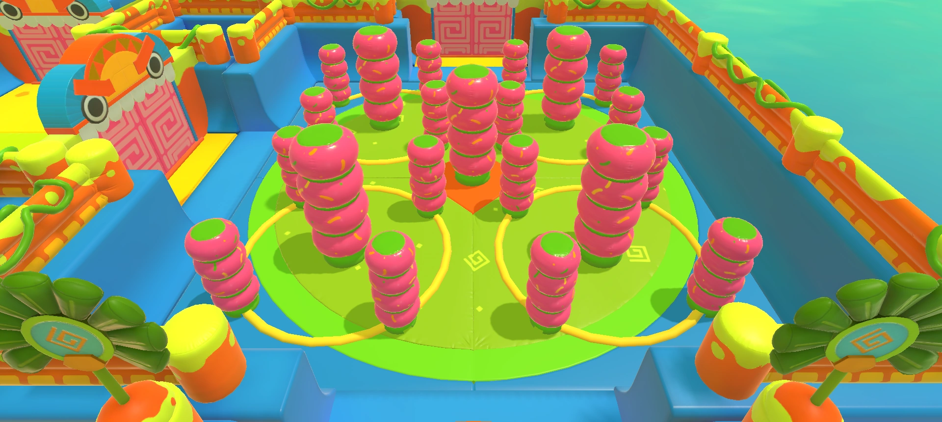 A room containing four expanding frogs with a single doughnut bumper in the center and a square bumper on each corner.