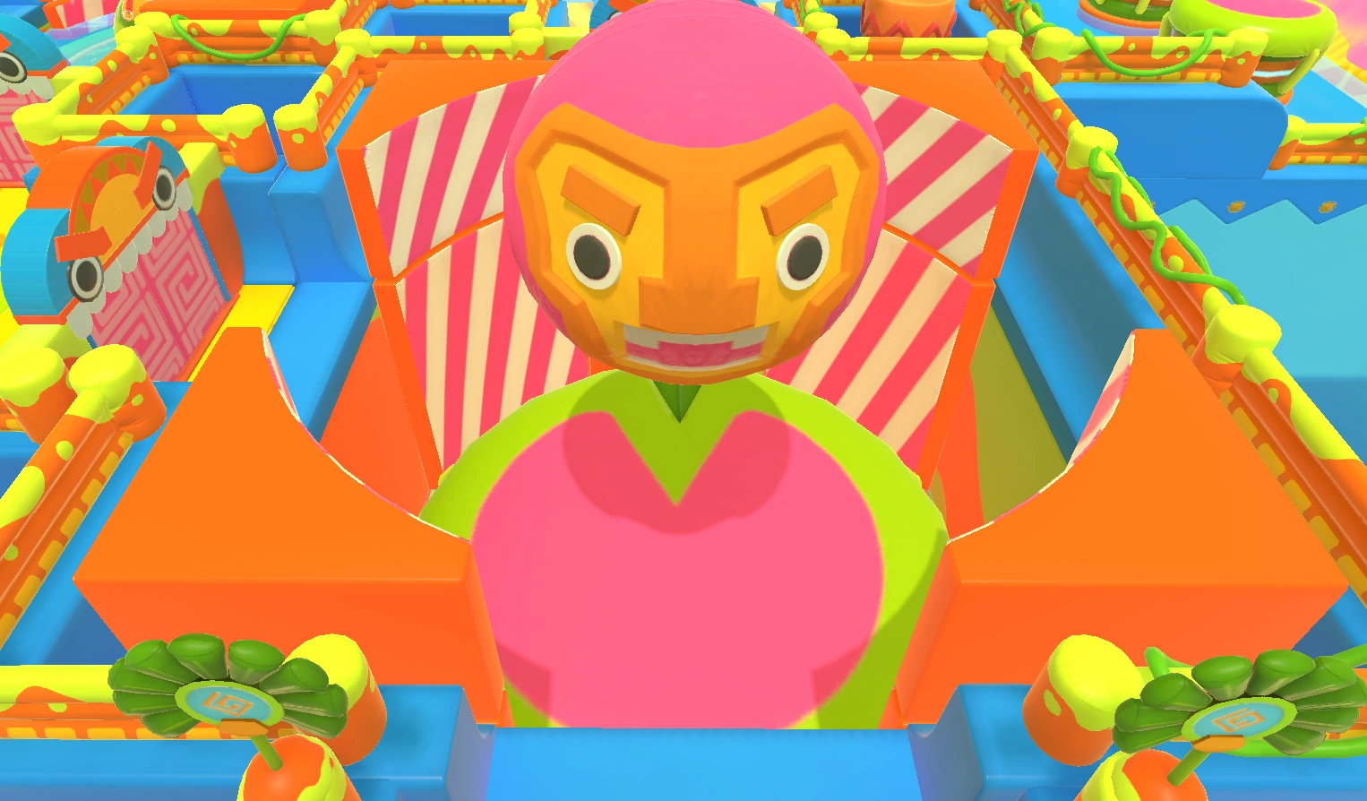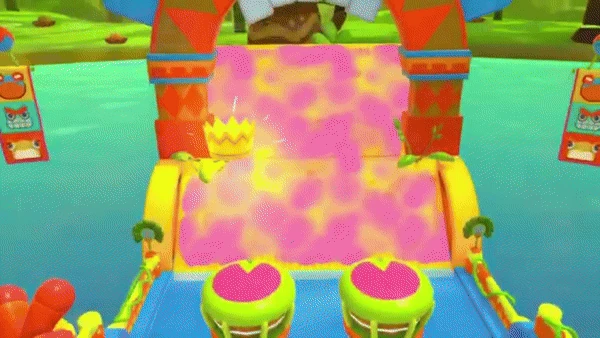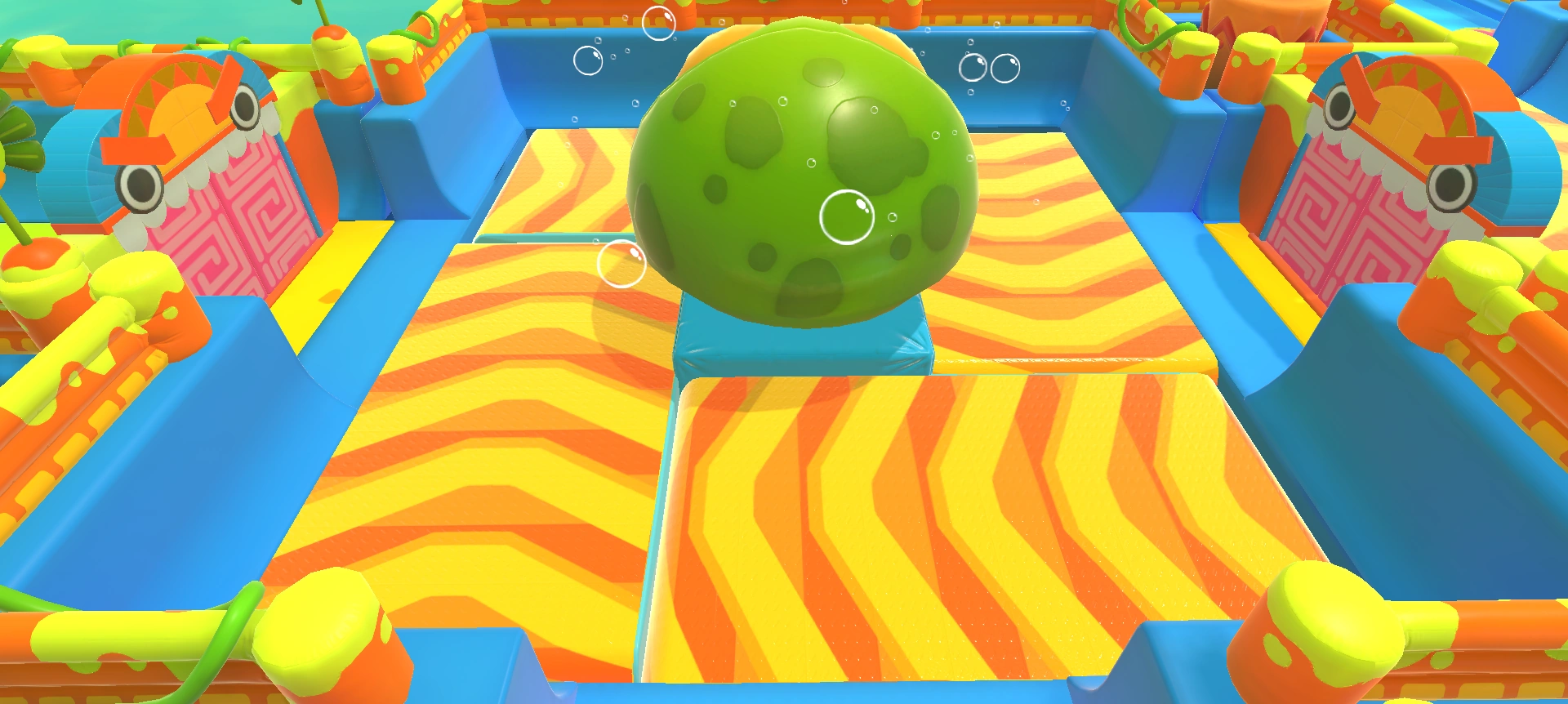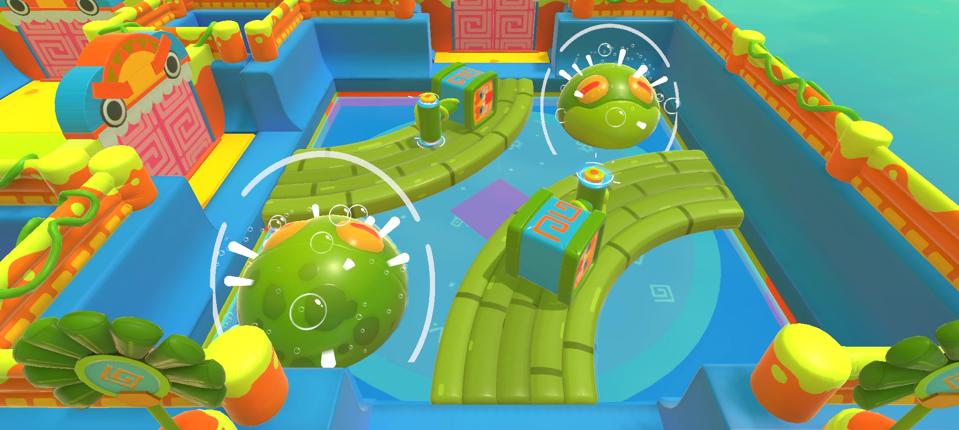 It is actually possible to walk between the frog and the corner bumpers even if the frog is inflated. Do so to reach the desired door, but be wary of other players as the room is quite cramped and they can cause you to bump into the obstacles.