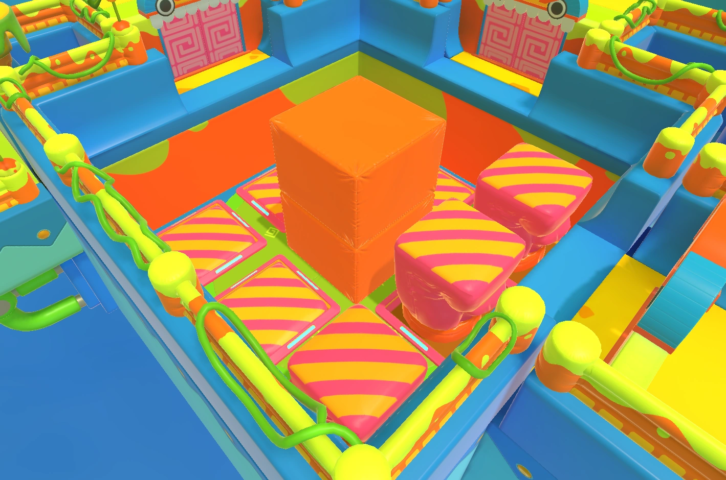 A room containing four Flippity Bippities (one in each corner) and a tall square bumper in the center.