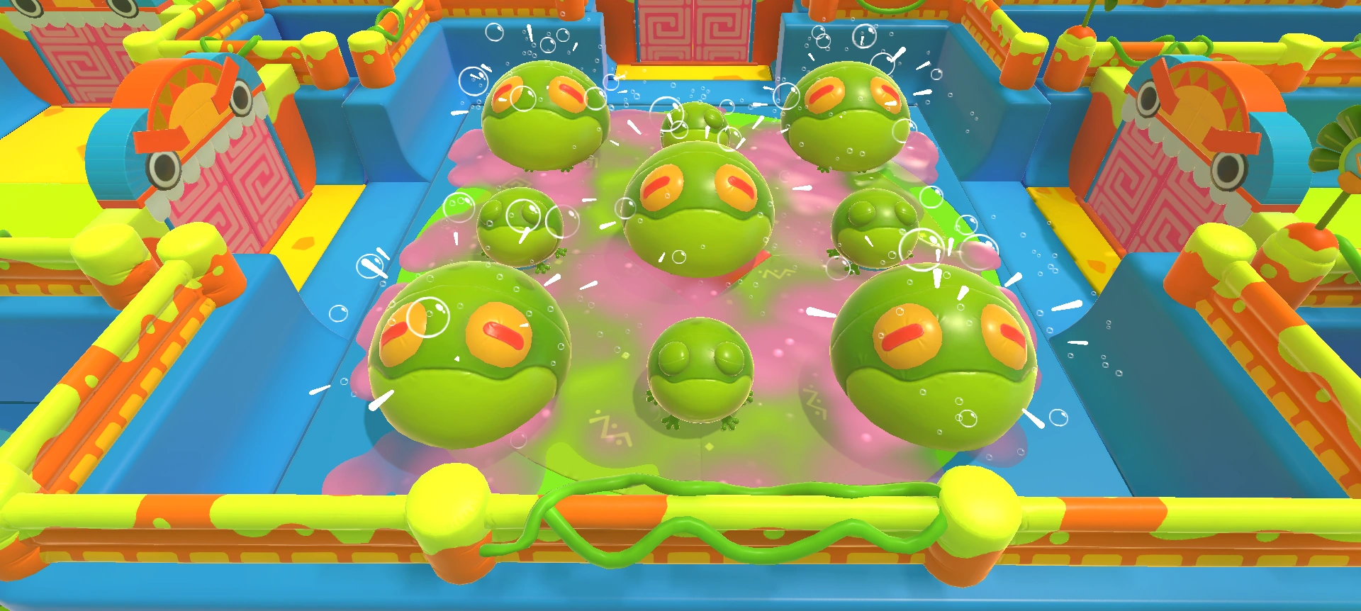 Weave between the frogs as you move towards a door by sticking close to the ones that are inflated or just deflated. Compensate for the slimy floor by changing directions before you feel is necessary, as traction is reduced.