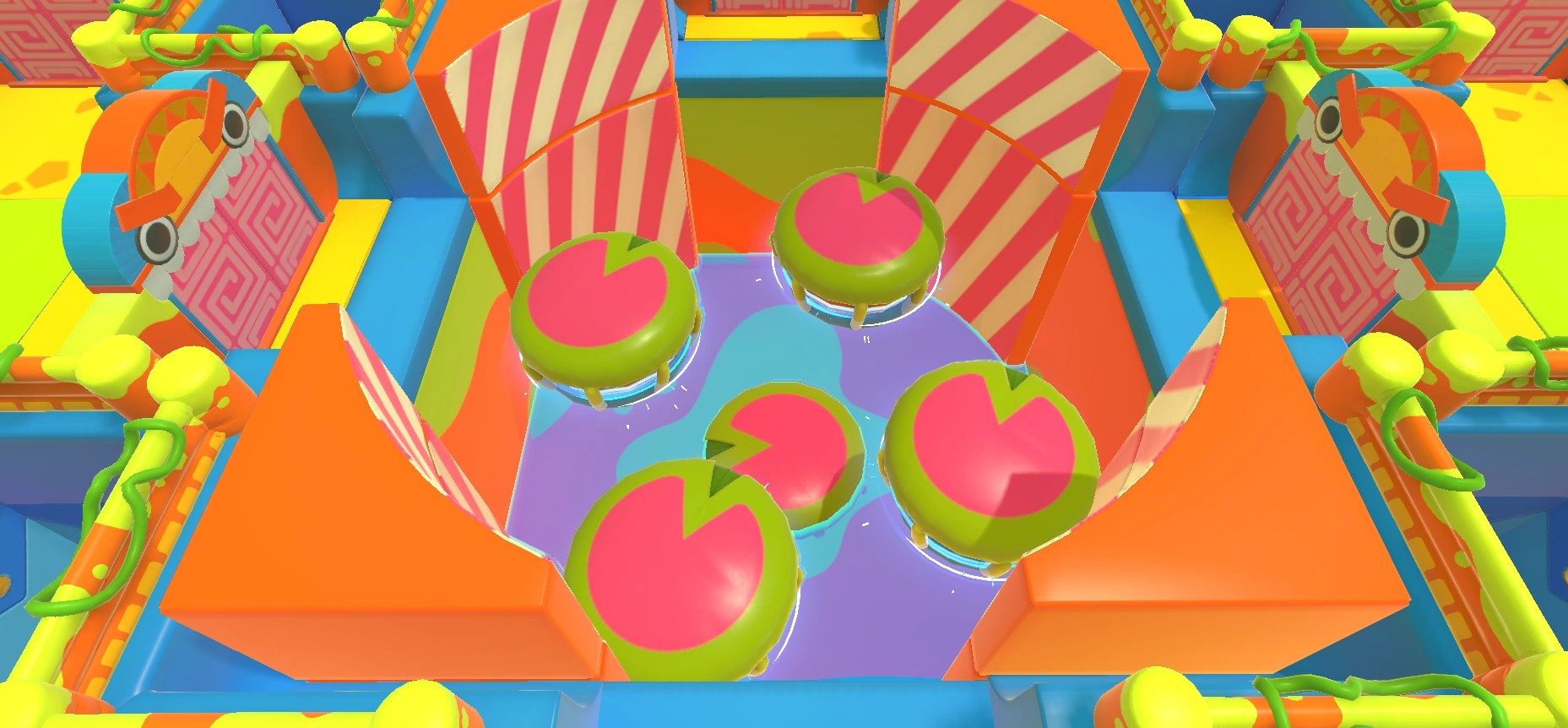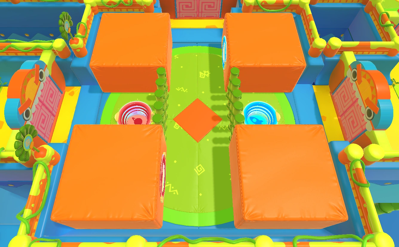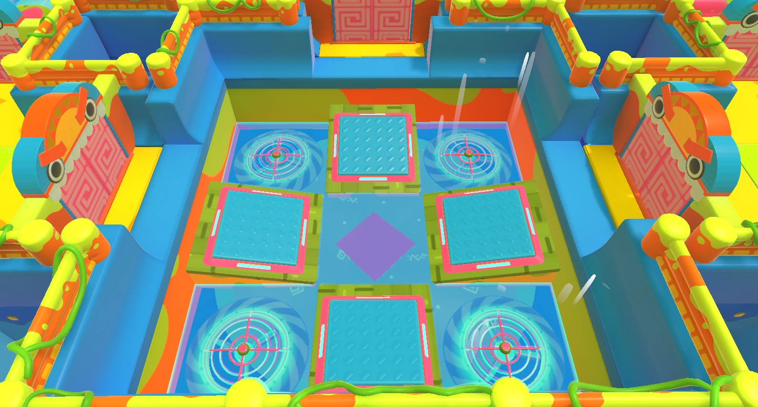 A room containing four sideways Lily pads at its center and a donut pusher between them and each corner (four in total).