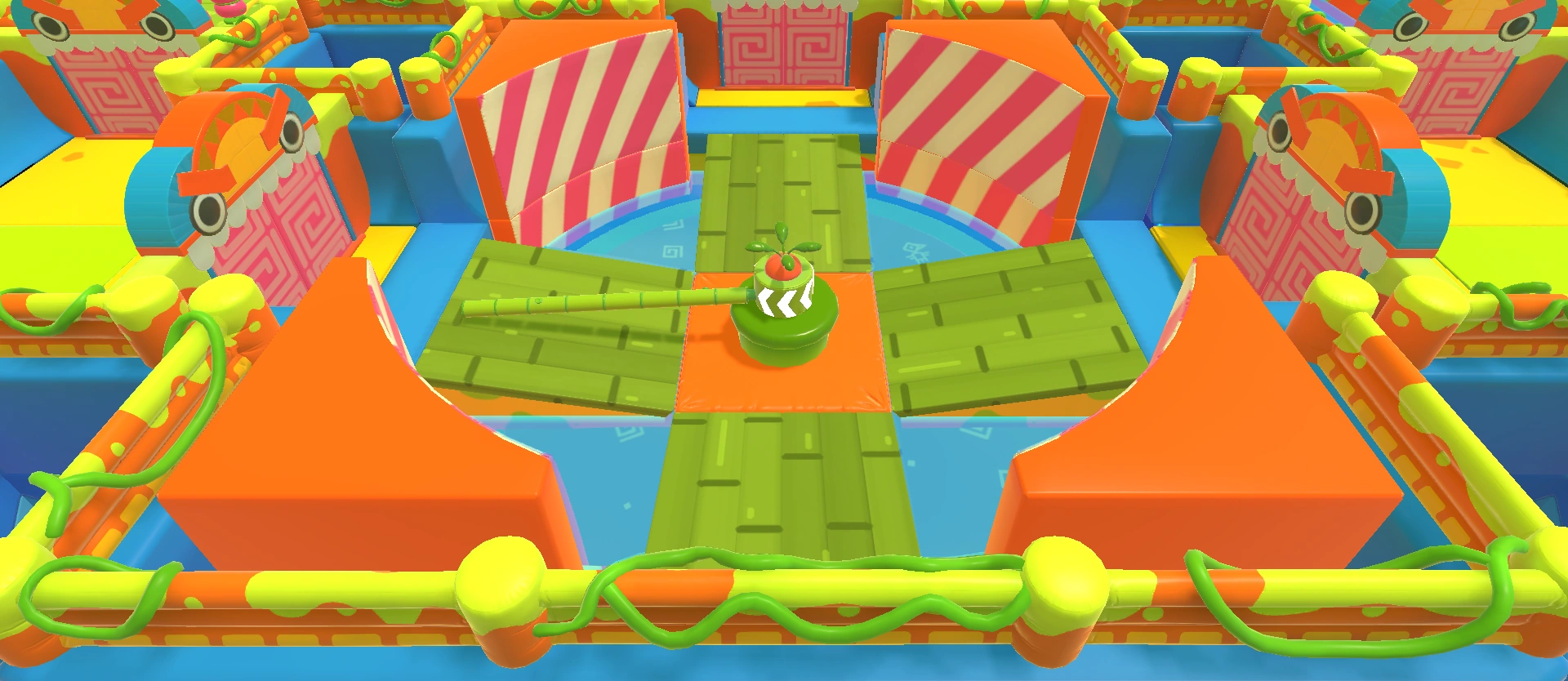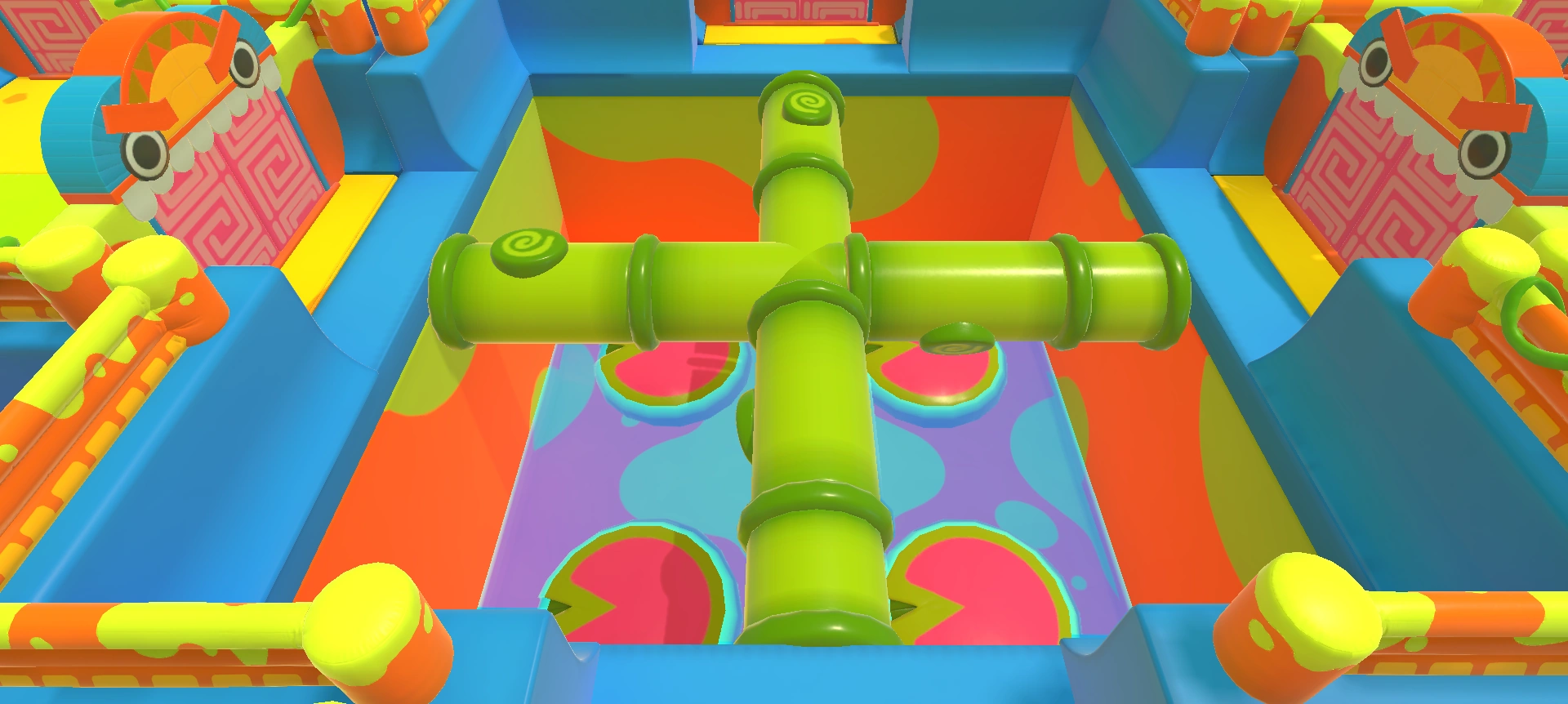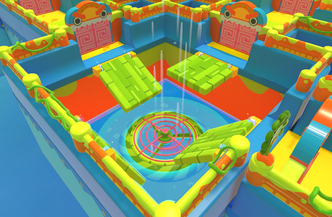 A room containing four sideways Lily pads at its center and a donut pusher between them and each corner (four in total).