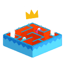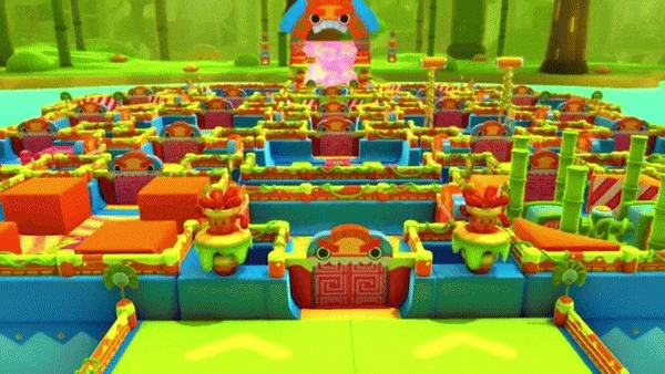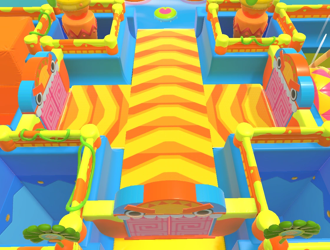 Lost Temple is a maze-like Final level. In it, players start in a semi-circle in a room with a single door, which they must break down in order to proceed. From there, they must find a path of real doors that will take them through a series of randomly selected preset rooms. These rooms contain mini-obstacle courses to make reaching the next door difficult. There are a total of 39 randomized rooms that can appear. Some rooms have 4 corner blocks to shape the room from square to circular. At the opposite end of the map, from the starting room is the crown room, which is never random. It contains a crown like the one on Fall Mountain, but this one moves left and right instead of up and down. Players must jump on a series of Lily Pads in order to grab it, and failing to do so will make them fall onto a Slime slope behind the crown. The room leading up to the crown room is never random as well, always consisting of a series of Conveyor Belts that lead players towards the real door that stands in the way of the crown.