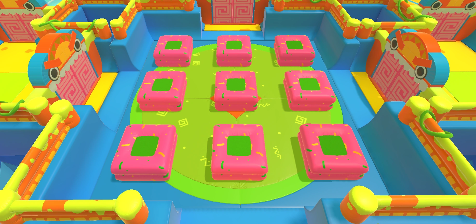 A room containing 9 bumpers arranged in a 3x3 grid pattern, with considerable gaps between them.