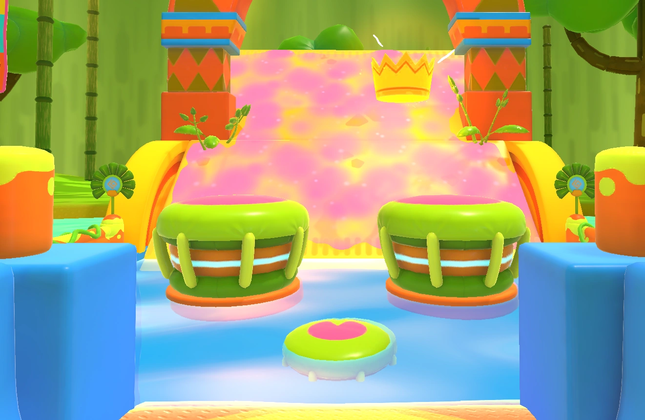 Navigate the room by going around the obstacles without touching any of them until you reach a door. The lily pads' hitbox is deceptively large, so opt to stay closer to the donut bumpers as you make your way out of the room.