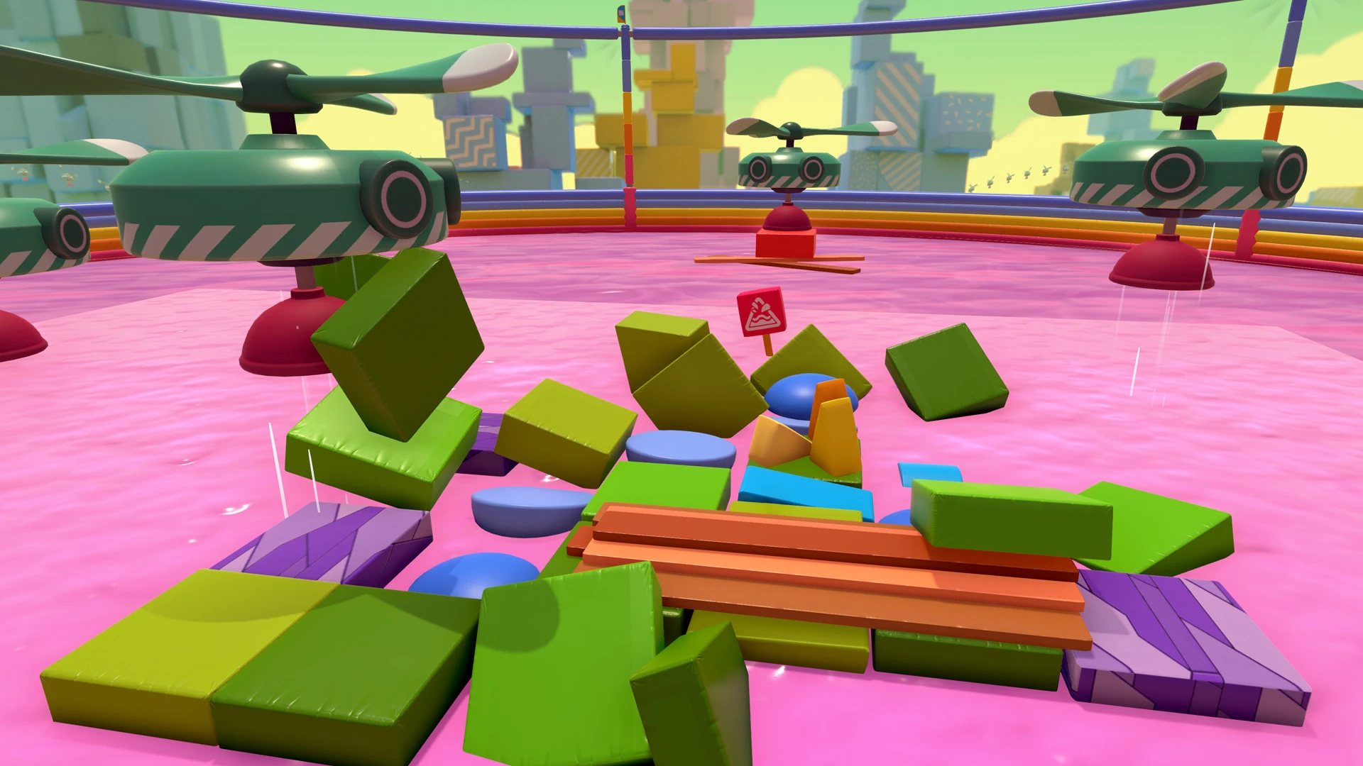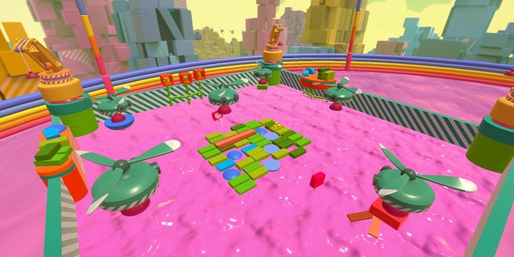 In Magnet Mayhem, players must avoid falling into the slime by staying on physics-enabled platforms. These include green blocks, blue hemispheres, blue Padded Semicircles, and brown planks. The main obstacles are the eponymous "magnets" that fly around the arena, picking up said platforms and displacing them. These are just Plungebots placed over Blizzard Fans that circle the arena via Rotation Controllers. A few Plungebots float in place outside the arena with objects already stuck to their plungers.