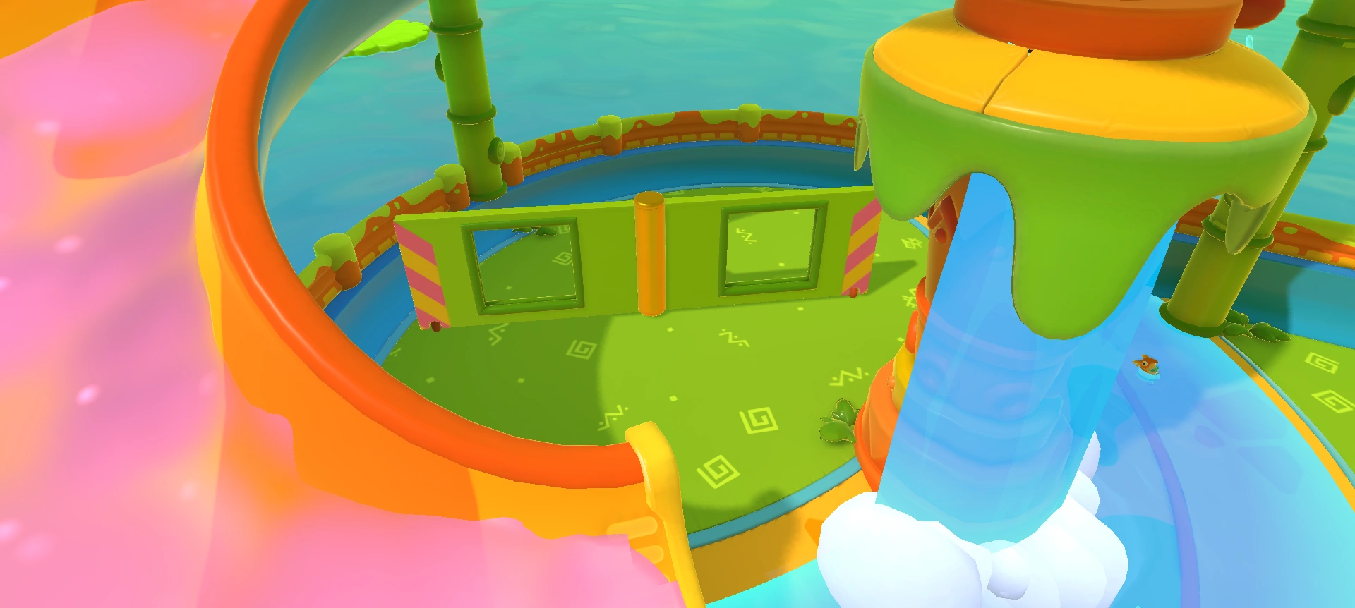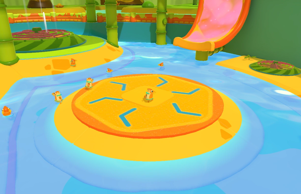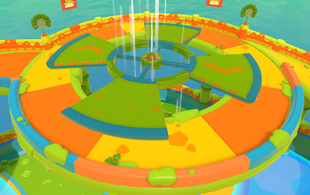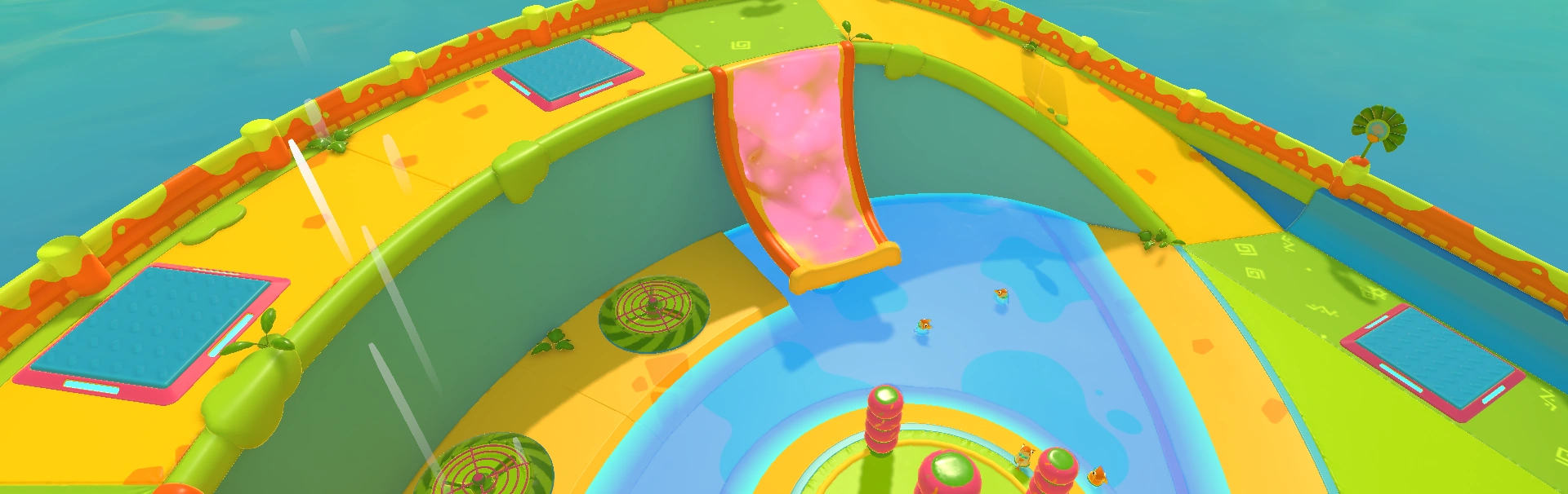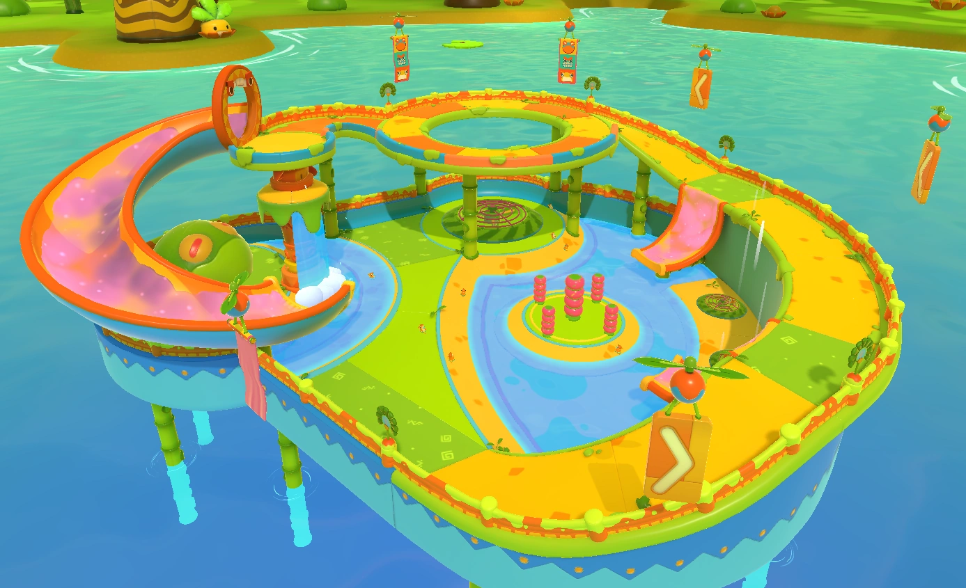 Pegwin Pool Party takes place in an arena divided between a lower area and an extensive walkway that runs above the edge of the arena. The walkway follows a relatively straight path from one end to the other: Starting by going up a steep ramp from the lower area, followed by a flat surface that contains two small slime slides as well as the players' spawn points for when the match starts. Following that is a gentler ramp that leads to a circular surface that runs around a hole. Finally, there's yet another gentle ramp that leads to a big spiral slime slide. All the slides as well as the hole will bring players down to the lower area (although it is possible to simply jump down from the walkway at any point).