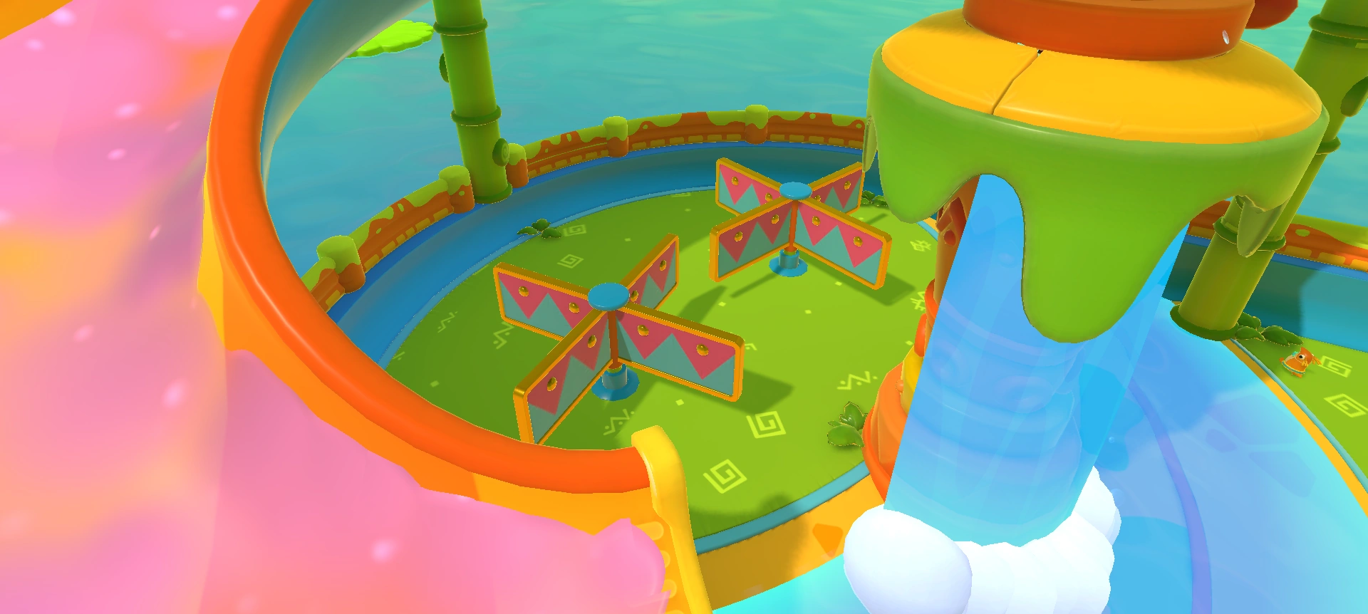 The lower area features two pools of water at a slightly lower elevation. The larger pool contains a circular island with a large donut bumper surrounded by four smaller ones that orbit around it, where all the Pegwins spawn at the start of the match. This pool also contains a small stretch of land between the ends of the two small slides. This stretch of land contains two blizzard fans that alternate between on and off, with only one of them being active at any given time (except for a few seconds at the very start of the match, where both fans will be active at the same time before they start alternating). The smaller pool contains a large island with an Expanding Frog behind a pillar concealed by a waterfall. Next to both pools is a larger blizzard fan surrounded by four pillars. It leads up to the circular hole in the walkway above. This fan alternates between on and off as well.