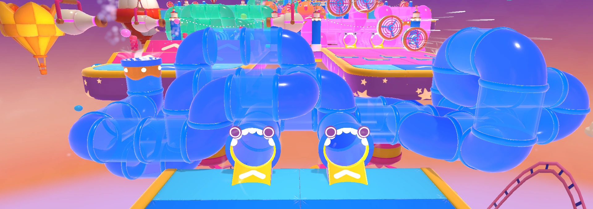 For the donut bumper platform, those shouldn't be too hard to avoid. Try using them to boost you forwards where possible, if you think you're behind and need to catch up. For the pivot platform and conveyor belt platform, there's nothing much to it other than to jump on the pivot platforms, then onto the conveyor belt. Try your best to land on the pivot platform from the conveyor belt, but make sure you don't get caught out by the platform swivelling. Finally, take the tube to the next section.
