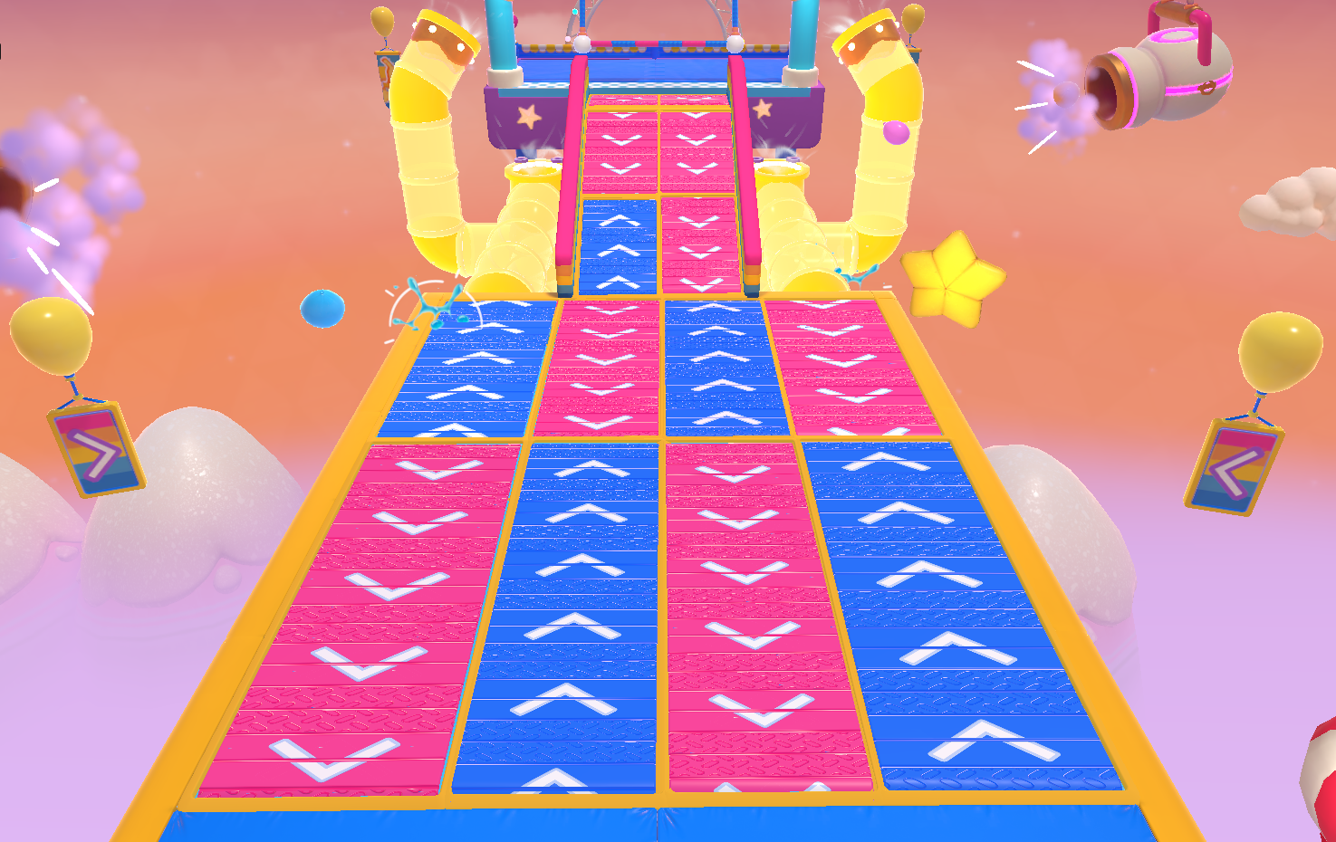 For the drums and hammers platforms, you can chain your bounces together so you don't land on the ground, but make sure you don't get hit by the hammers in the process. For the middle platform, carefully dodge the balloons and hammers; these hammers are very costly and can easily send you flying off the side, making you retry that platform. Again, randomly pick a tube and head to the next platform.