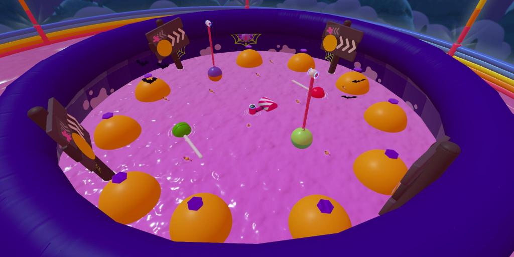Players spawn over one of ten giant yellow Spheres, in a giant bowl filled with slime. Players must move to stay on top of their Sphere as it rolls around to avoid falling. Numerous obstacles throughout the arena may alter the course of the sphere, knocking players off. Invisible Power-Up Spawners in the arena grants the Rubber Chicken Power-Up to players, which can use to knock other players into the slime.