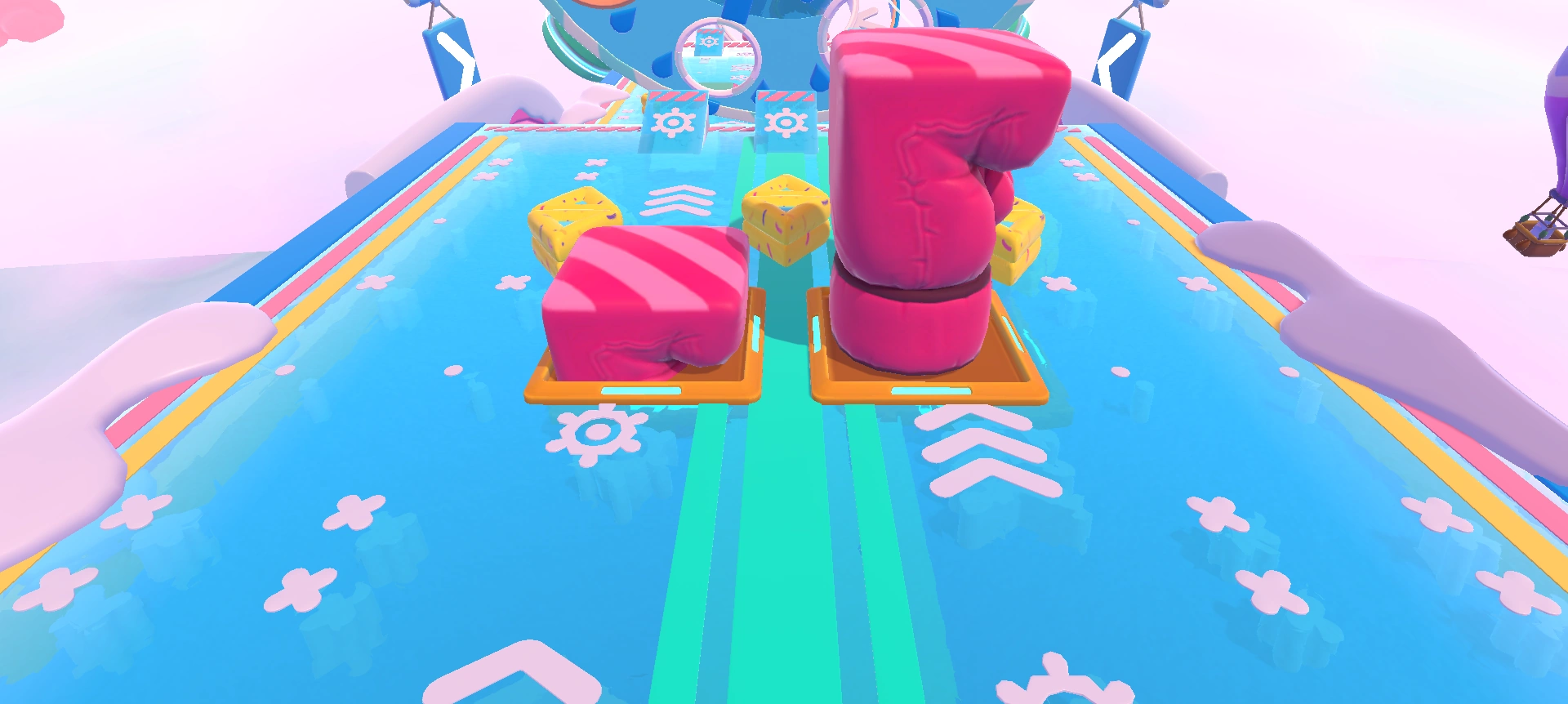 There are some main Yeetus groups recommended; the initial group of 3 Yeetuses in the middle, and the Yeetuses positioned off to the sides nearer to the end of the slope. The slower the Yeetus, the easier it is to get a good hit. If you're struggling to get a good hit in when approaching from behind, then simply head for the slower Yeetus near the end but overshoot slightly, jump and move backwards in the air to cut your speed, then walk in the opposite direction to the swing and jump into the Yeetus to be hit. For all Yeetuses, do watch out for the Ringus Dingus carefully positioned directly before the wheel, and carefully steer yourself into the middle gold ring.